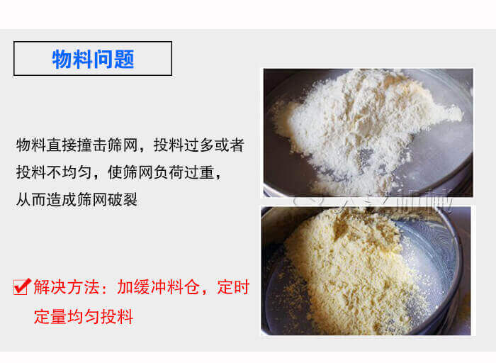 物料直接撞擊篩網(wǎng),投料過多或者投料不均勻,使篩網(wǎng)負(fù)荷過重,從而造成篩網(wǎng)破裂