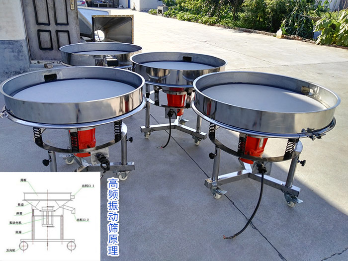 超聲波振動篩是將220v、50HZ或110v、60HZ電能轉化為38KHZ的高頻電能,輸入超聲換能器,將其變成38KHZ機械振動,從而達到高效篩分和清網的目的。超微細粉體接受巨大的超聲加速度,使篩面上的物料始終保持懸浮狀態,從而抑制粘附、摩擦、平降、等堵網因素。解決了強吸附性、易團聚、高靜電、高精細、高密度、輕比重等篩分難題,使超細微粉篩分不再難事,特別適合高品質、精細粉體的用戶使用 高頻振動篩采用筒體式偏心軸激振器及偏塊調節振幅,物料篩淌線長,篩分規格多,具有結構可靠、激振力強、篩分效率高、振動噪音小、堅固耐用、維修方便、使用安全等特點。由于高頻振動篩采用了高頻率,一方面破壞了礦漿表面的張力和細粒物料在篩面上的高速振蕩,加速了大密度有用礦物和析離作用,增加了小于分離粒度物料與篩孔接觸的概率。